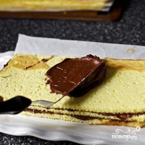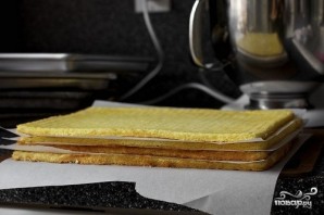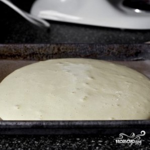 Берем форму для выпекания, смазываем сливочным маслом. Вливаем в форму 1/6 нашего теста, ставим ее в разогретую до 200 градусов духовку, и выпекаем до готовности коржа. Аналогично печем еще 5 коржей.