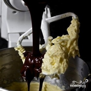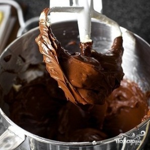 При помощи миксера взбиваем 250 граммов масла (остальные мы уже использовали при приготовлении коржей), шоколад, какао, сахарную пудру, ром и яйца.