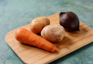 Свеклу, картофель и морковь помойте, отварите или запеките в духовке до готовности. Затем остудите.