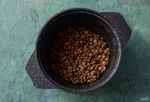 Чечевицу промойте в холодной воде. Переложите в кастрюлю, добавьте воды в два раза больше от объема чечевицы. Варите на среднем огне, пока чечевица не станет мягкой. Потом остудите.