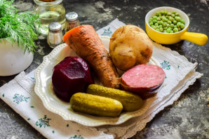 Рецепт не отнимет много времени. Овощи для салата лучше подготовить заранее, можно отварить или запечь, также необходимо выбрать вкусную варено-копченую колбасу. Для заправки используем традиционно душистое постное масло. Подавать салат можно в качестве обеда, ужина, или для разнообразия праздничного рациона Подавайте к столу.