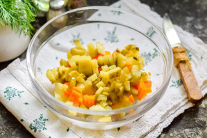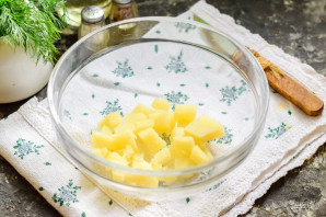 Очистите вареный картофель и нарежьте небольшими по размеру кубиками, сложите их в глубокую миску.