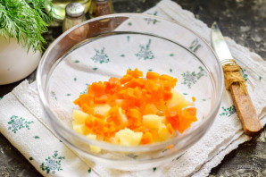 Вареную морковь также очистите и измельчите небольшими кубиками.