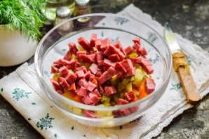 Копченую колбасу нарежьте небольшими кубиками и добавьте в салат.