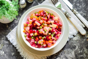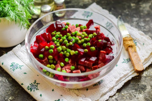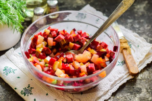 Теперь очистите вареную свеклу, нарежьте ее небольшими кубиками и добавьте в салат.