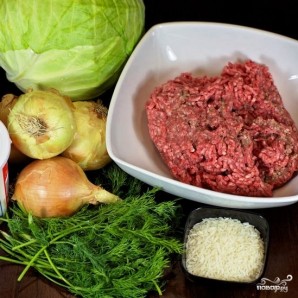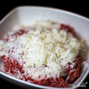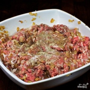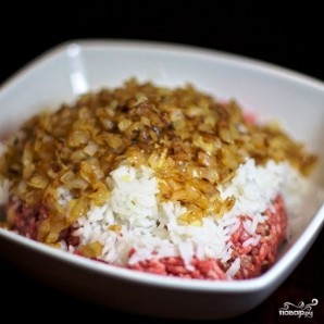 Пока капуста варится, приготовим фарш. Смешаем фарш и рис.