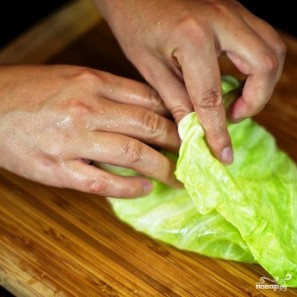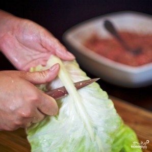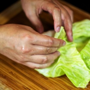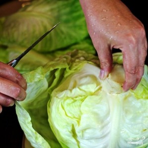 Теперь займемся непосредственно сборкой голубцов. Возьмем наш кочан капусты, при помощи ножа отделим крупные листья.