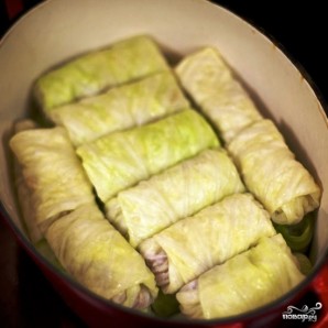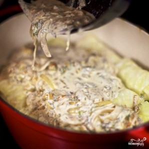 Получившимся соусом заливаем голубцы. Форму с голубцами ставим в разогретую до 190 градусов духовку и запекаем около 90 минут (до готовности).