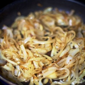 Теперь - время заняться соусом. Оставшиеся 2 головки лука нарежем кольцами и обжарим в масле до золотистости.
