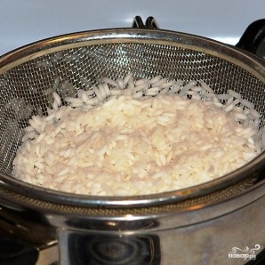 Рис отвариваем до полуготовности и откидываем на дуршлаг.