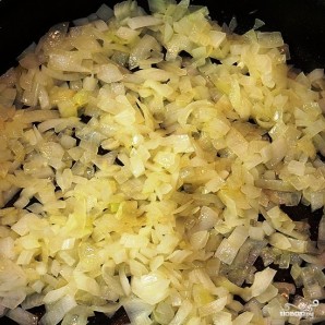 Две головки репчатого лука мелко нарезаем и обжариваем в подсолнечном масле до золотистости. Отставляем.