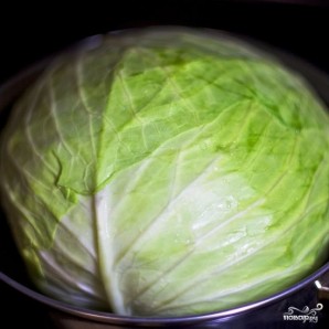 Теперь пришло время подготовить капустные листья. Возьмем большую кастрюлю (такую, чтобы в нее влезла капуста), положим в нее капусту, добавим немного (полстакана, не больше) воды, поставим на огонь и доведем до кипения. Затем удалим верхние жесткие листья капусты, а кочан положим обратно в кастрюлю и покипятим еще 5-10 минут, до выкипания воды.